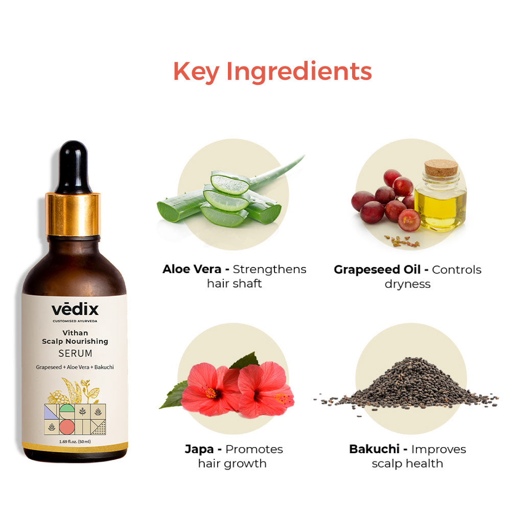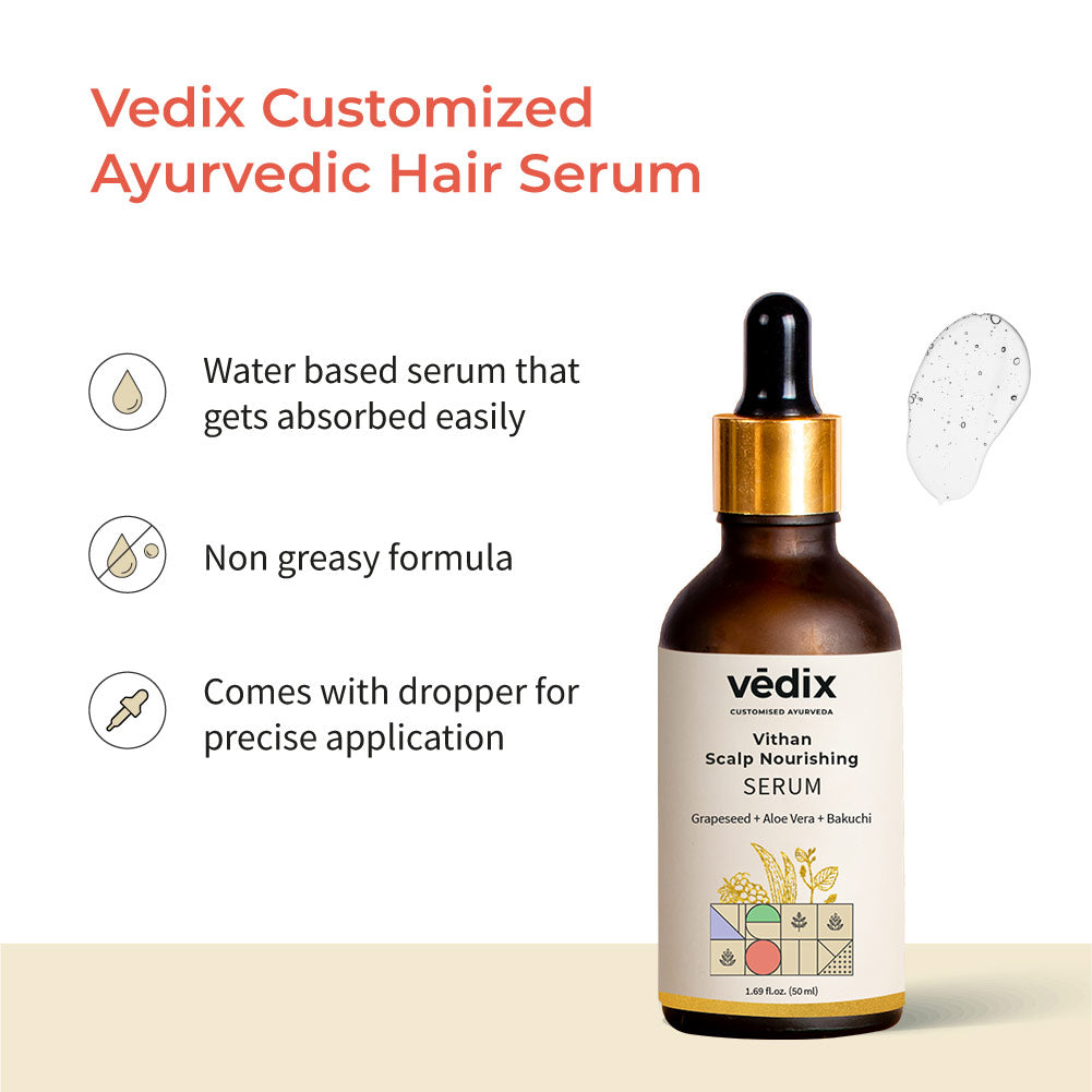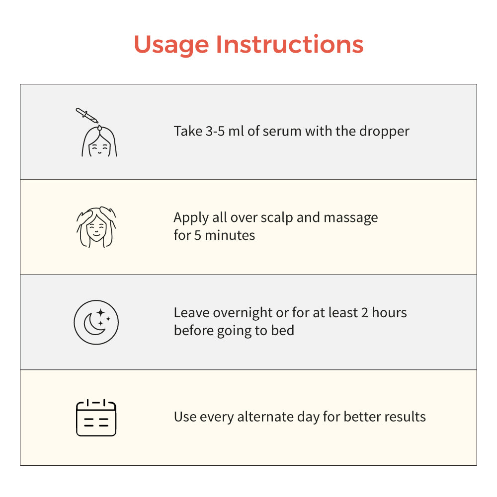 AYURVEDIC HAIR GROWTH SERUM: Regulates hair fall and helps lessen hair breakage. Helps rejuvenate damaged hair, strengthens hair roots & follicles.